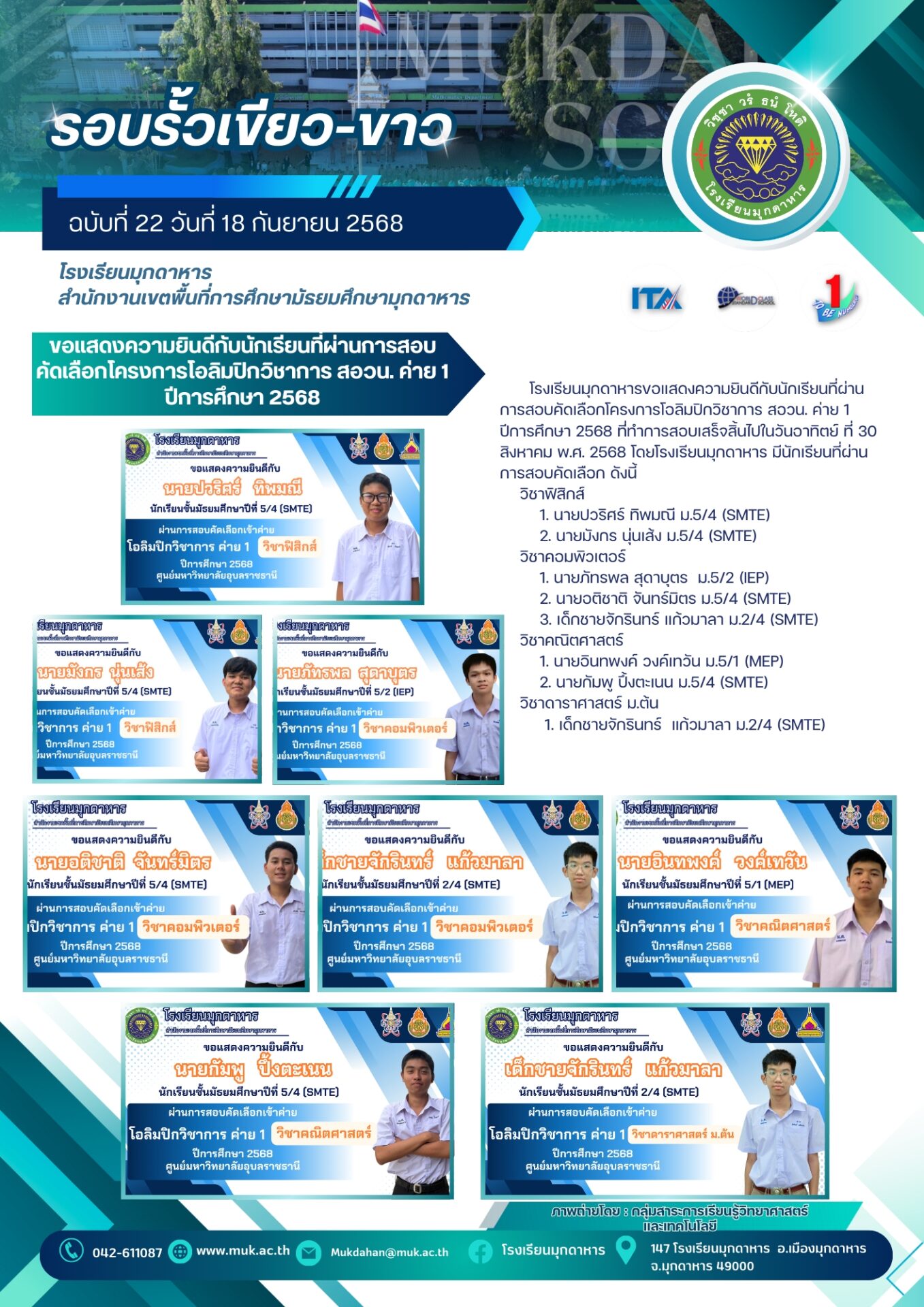 โรงเรียนมุกดาหาร ฉบับที่ 22 วันที่ 18 กันยายน 2568 / จดหมายข่าวโรงเรียนในสังกัด / By พิมพ์ธิดา อารีรักษ์