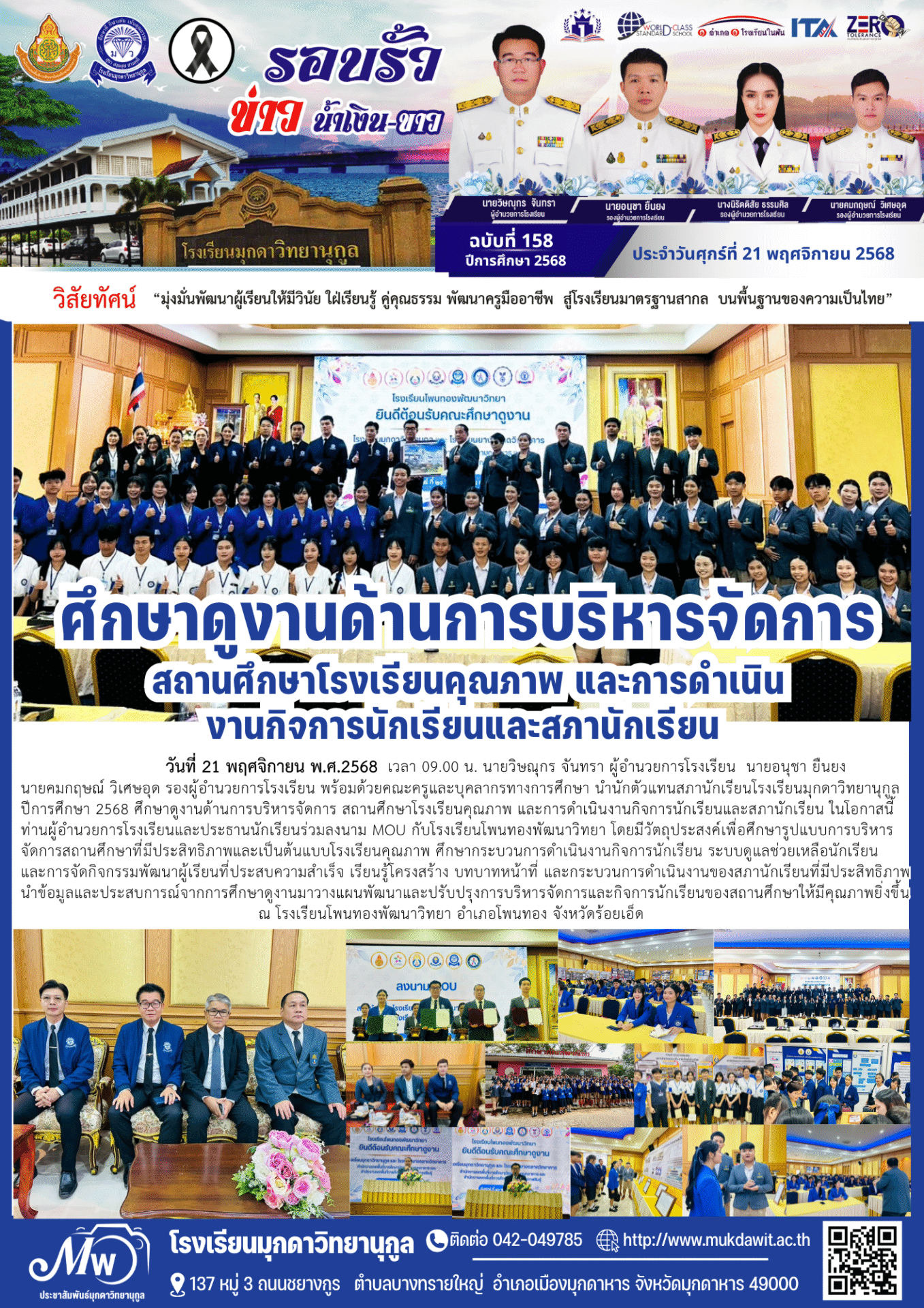 โรงเรียนมุกดาวิทยานุกูล ฉบับที่ 158 วันที่ 21 พฤศจิกายน 2568 / จดหมายข่าวโรงเรียนในสังกัด / By พิมพ์ธิดา อารีรักษ์