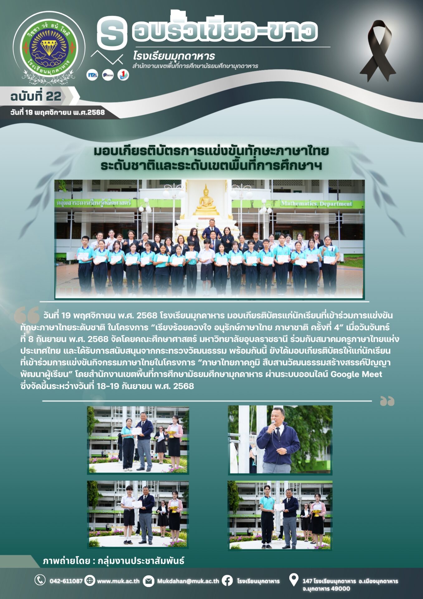 โรงเรียนมุกดาหาร ฉบับที่ 22 วันที่ 19 พฤศจิกายน 2568 / จดหมายข่าวโรงเรียนในสังกัด / By พิมพ์ธิดา อารีรักษ์