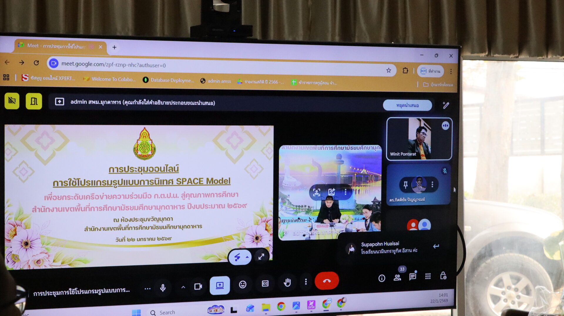ดร.พลชัย ชุมปัญญา ผอ.สพม.มุกดาหาร เป็นประธานการประชุมออนไลน์ เรื่อง การใช้โปรแกรมรูปแบบการนิเทศ SPACE Model เพื่อยกระดับเครือข่ายความร่วมมือ ก.ต.ป.น. สู่คุณภาพการศึกษา ของสำนักงานเขตพื้นที่การศึกษามัธยมศึกษามุกดาหาร จัดการประชุมในรูปแบบออนไลน์ผ่านโปรแกรม Zoom Meeting โดยมีกลุ่มเป้าหมายเป็นโรงเรียนในสังกัดสำนักงานเขตพื้นที่การศึกษามัธยมศึกษามุกดาหาร จำนวน 30 โรงเรียน เพื่อเสริมสร้างความรู้ ความเข้าใจ และพัฒนาศักยภาพในการใช้โปรแกรมรูปแบบการนิเทศ SPACE Model อันเป็นกลไกสำคัญในการยกระดับเครือข่ายความร่วมมือของคณะกรรมการติดตาม ตรวจสอบ ประเมินผล และนิเทศการศึกษา (ก.ต.ป.น.) สู่การพัฒนาคุณภาพการศึกษาอย่างเป็นรูปธรรม ในการนี้ นางวริศรา สัพโส รองผอ.สพม.มุกดาหาร พร้อมด้วย นางวราภา สามาอาพัฒน์ ศึกษานิเทศก์เชี่ยวชาญ ผู้อำนวยการกลุ่มนิเทศ ติดตาม และประเมินผลการจัดการศึกษา และ นายเธียรธวัช จันทร์ไตรรัตน์ นักวิชาการคอมพิวเตอร์ปฏิบัติการ นักวิชาการศึกษาปฏิบัติการ ปฏิบัติหน้าที่ผู้อำนวยการกลุ่ม ICT ร่วมเป็นวิทยากรบรรยายให้ความรู้แก่ผู้เข้าร่วมการประชุมทั้งนี้ การประชุมจัดขึ้น ณ ห้องประชุมขวัญมุกดา สำนักงานเขตพื้นที่การศึกษามัธยมศึกษามุกดาหาร