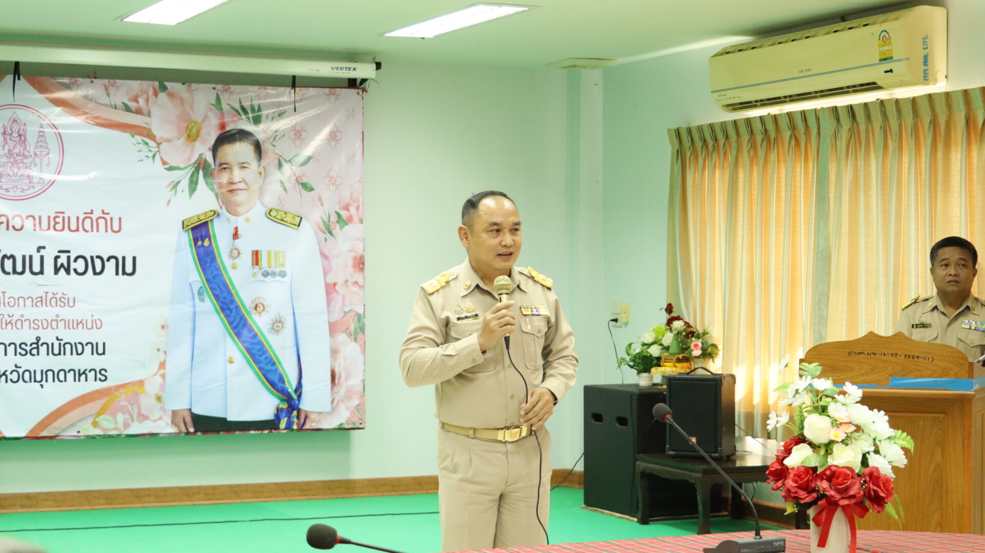 ดร.พลชัย ชุมปัญญา ผู้อำนวยการสำนักงานเขตพื้นที่การศึกษามัธยมศึกษามุกดาหาร พร้อมด้วย นายวิทยา วังคะฮาต รองผู้อำนวยการสำนักงานเขตพื้นที่การศึกษามัธยมศึกษามุกดาหาร และนางสิริรัตน์ ใจทาน ผู้อำนวยการกลุ่มอำนวยการ ร่วมแสดงความยินดีกับ นายจีรวัฒน์ ผิวงาม เนื่องในโอกาสได้รับแต่งตั้งให้ดำรงตำแหน่งผู้อำนวยการสำนักงานส่งเสริมสวัสดิการและสวัสดิภาพครูและบุคลากรทางการศึกษา จังหวัดมุกดาหาร (ผอ.สกสค.มุกดาหาร)