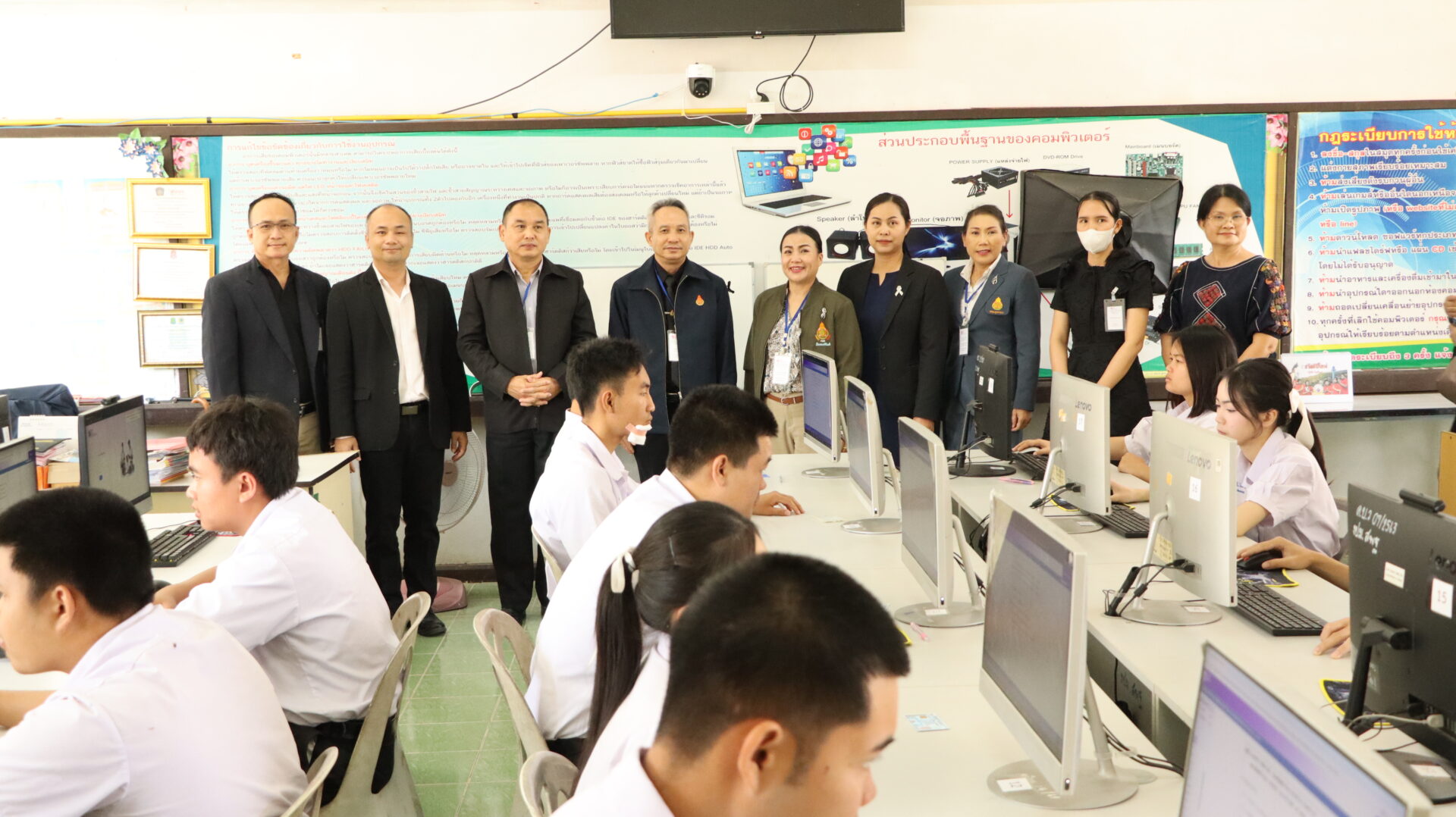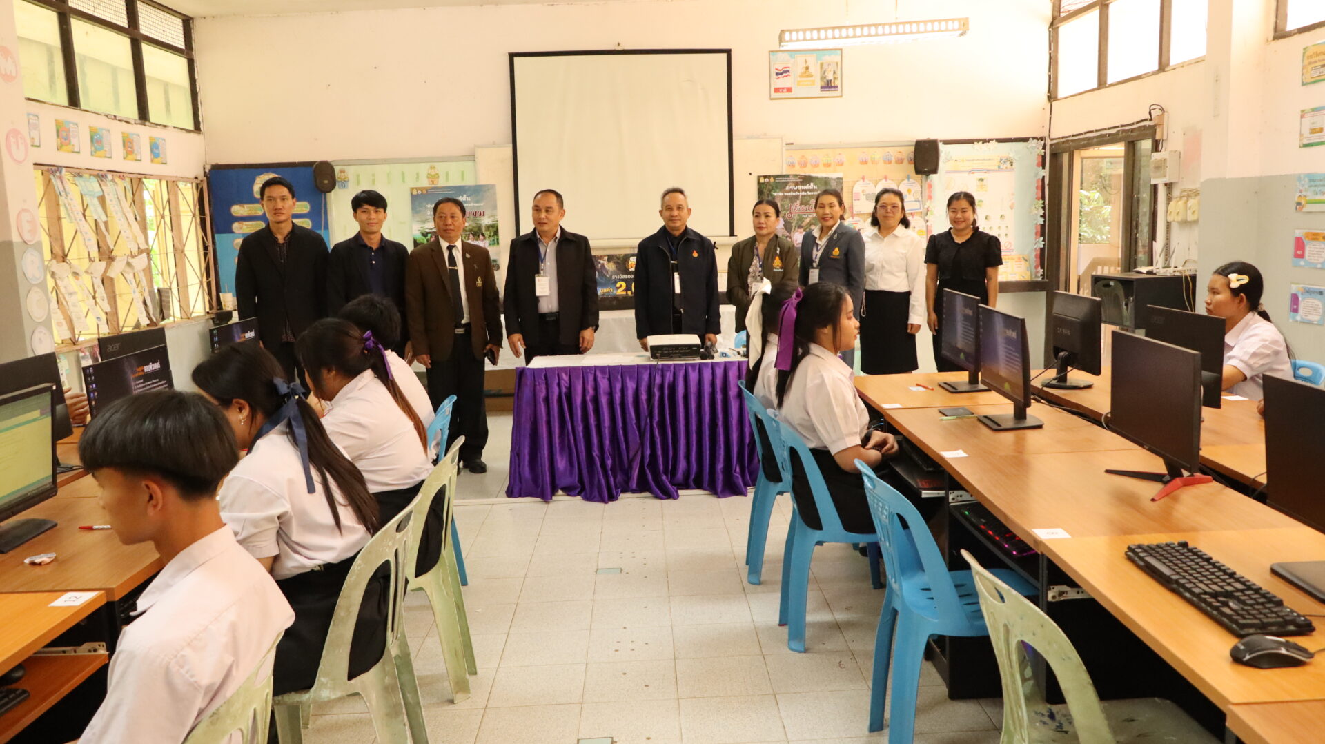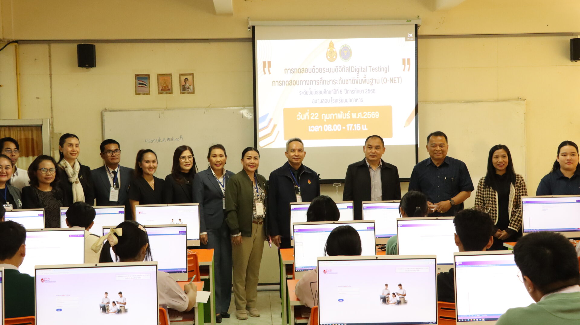 ดร.พลชัย ชุมปัญญา ผอ.สพม.มุกดาหาร พร้อมด้วย นายวิทยา วังคะฮาต รองผอ.สพม.มุกดาหาร นางวราภา สามาอาพัฒน์ ศึกษานิเทศก์เชี่ยวชาญ ผู้อำนวยการกลุ่มนิเทศ ติดตามและประเมินผลการจัดการศึกษา รวมทั้ง นางกัลยณัฏฐ์ สุวรรณไตรย์ นายสิทธิพงษ์ เมืองโคตร และนางสาวกัญจนพร ดอนหล้า ศึกษานิเทศก์ชำนาญการพิเศษ ลงพื้นที่ตรวจเยี่ยมและให้กำลังใจ ณ สนามสอบการทดสอบทางการศึกษาระดับชาติขั้นพื้นฐาน (O-NET) ระดับชั้นมัธยมศึกษาปีที่ 6 ปีการศึกษา 2568 ซึ่งจัดสอบด้วยระบบดิจิทัล เพื่อติดตามความเรียบร้อยของการดำเนินงาน สร้างขวัญและกำลังใจให้แก่นักเรียน ตลอดจนเสริมสร้างความเชื่อมั่นแก่ผู้ปกครองและสถานศึกษาในกระบวนการจัดการสอบของสำนักงานเขตพื้นที่การศึกษามัธยมศึกษามุกดาหารในสถานศึกษาในสังกัดจำนวน 4 โรงเรียน ได้แก่ โรงเรียนมุกดาหาร โรงเรียนคำบกวิทยาคาร โรงเรียนร่มเกล้าพิทยาสรรค์ และโรงเรียนคำสร้อยพิทยาสรรค์ โดยมีผู้บริหารสถานศึกษาและคณะครูให้การต้อนรับและอำนวยความสะดวกเป็นอย่างดียิ่ง