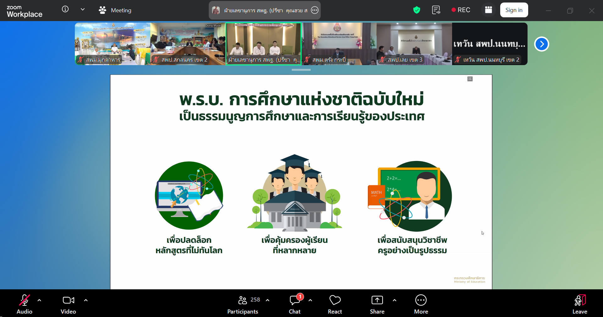 ดร.พิเชฐ โพธิ์ภักดี เลขาธิการคณะกรรมการการศึกษาขั้นพื้นฐาน พร้อมด้วย ดร.พิเชฐร์ วันทอง ดร.วิษณุ ทรัพย์สมบัติ นางภัทรวรรณ ภัทรบวรวุฒิ รองเลขาธิการคณะกรรมการการศึกษาขั้นพื้นฐาน ร่วมประชุมมอบนโยบายแก่ผู้บริหารการศึกษาในสำนักงานเขตพื้นที่การศึกษาทั่วประเทศ ในการประชุมผู้บริหาร สพฐ. ครั้งที่ 14/2569 ผ่านระบบออนไลน์ โดยผู้บริหาร สพม.มุกดาหาร นำโดย ดร.พลชัย ชุมปัญญา ผู้อำนวยการสำนักงานเขตพื้นที่การศึกษามัธยมศึกษามุกดาหาร พร้อมด้วย นางวริศรา สัพโส นายวิทยา วังคะฮาต รองผู้อำนวยการสำนักงานเขตพื้นที่การศึกษามัธยมศึกษามุกดาหาร เข้าร่วมรับฟังนโยบายเพื่อนำมาดำเนินการในสำนักงานและสถานศึกษาในสังกัดต่อไป