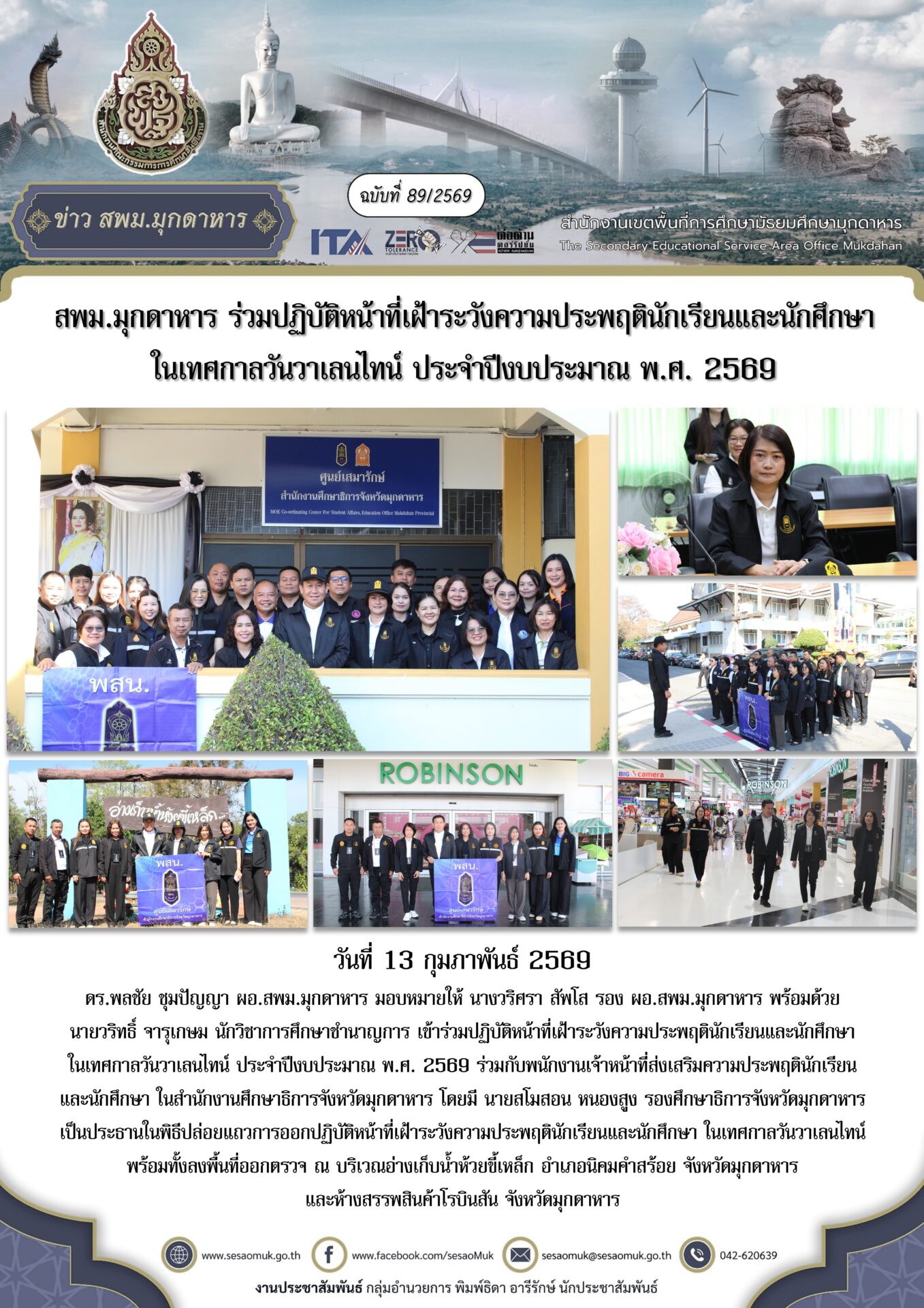 วันที่ 13 กุมภาพันธ์ 2569 ดร.พลชัย ชุมปัญญา ผอ.สพม.มุกดาหาร มอบหมายให้ นางวริศรา สัพโส รอง ผอ.สพม.มุกดาหาร พร้อมด้วย นายวริทธิ์ จารุเกษม นักวิชาการศึกษาชำนาญการ เข้าร่วมปฏิบัติหน้าที่เฝ้าระวังความประพฤตินักเรียนและนักศึกษาในเทศกาลวันวาเลนไทน์ ประจำปีงบประมาณ พ.ศ. 2569 ร่วมกับพนักงานเจ้าหน้าที่ส่งเสริมความประพฤตินักเรียนและนักศึกษา ในสำนักงานศึกษาธิการจังหวัดมุกดาหาร โดยมี นายสโมสอน หนองสูง รองศึกษาธิการจังหวัดมุกดาหารเป็นประธานในพิธีปล่อยแถวการออกปฏิบัติหน้าที่เฝ้าระวังความประพฤตินักเรียนและนักศึกษา ในเทศกาลวันวาเลนไทน์ พร้อมทั้งลงพื้นที่ออกตรวจ ณ บริเวณอ่างเก็บน้ำห้วยขี้เหล็ก อำเภอนิคมคำสร้อย จังหวัดมุกดาหาร และห้างสรรพสินค้าโรบินสัน จังหวัดมุกดาหาร