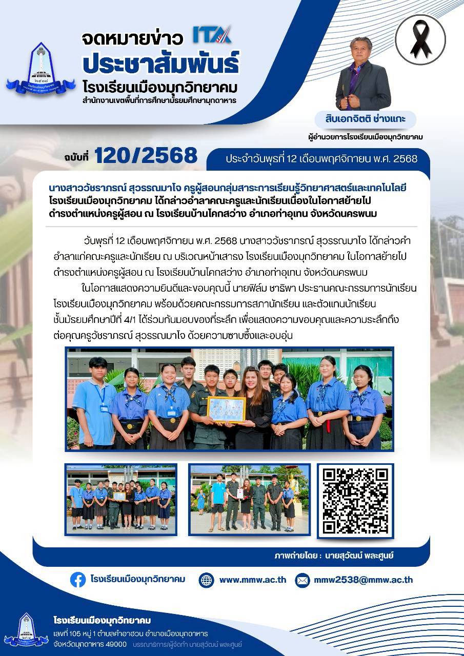 โรงเรียนเมืองมุกวิทยาคม ฉบับที่ 120 วันที่ 12 พฤศจิกายน 2568 จดหมายข่าวโรงเรียนในสังกัด / พิมพ์ธิดา อารีรักษ์ โรงเรียนเมืองมุกวิทยาคม ฉบับที่ 120 วันที่ 12 พฤศจิกายน 2568 Read More »