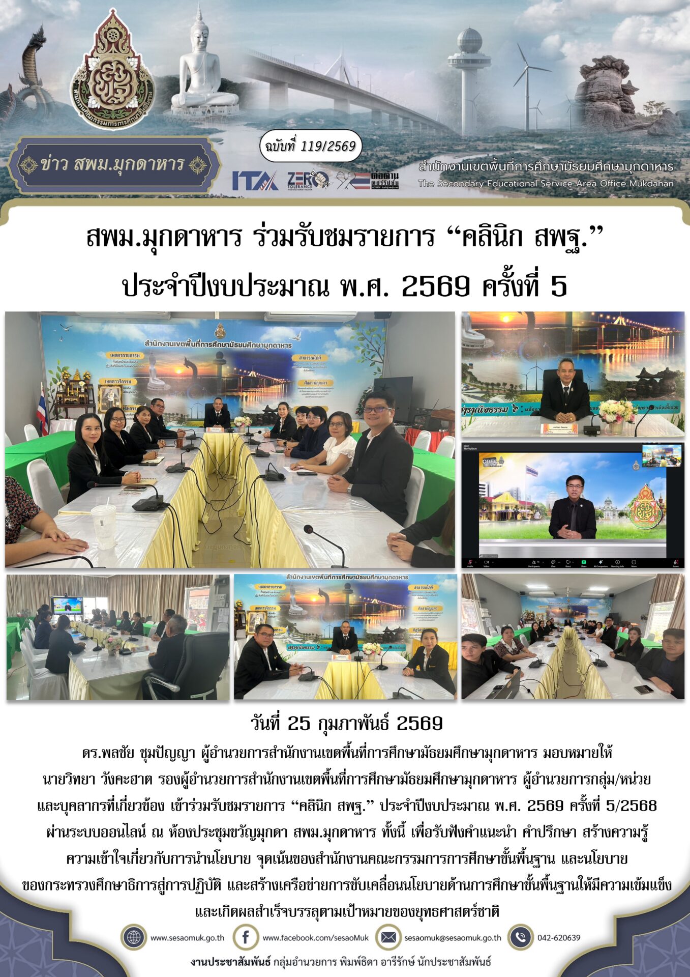 วันที่ 25 กุมภาพันธ์ 2569 ดร.พลชัย ชุมปัญญา ผู้อำนวยการสำนักงานเขตพื้นที่การศึกษามัธยมศึกษามุกดาหาร มอบหมายให้ นายวิทยา วังคะฮาต รองผู้อำนวยการสำนักงานเขตพื้นที่การศึกษามัธยมศึกษามุกดาหาร ผู้อำนวยการกลุ่ม/หน่วย และบุคลากรที่เกี่ยวข้อง เข้าร่วมรับชมรายการ “คลินิก สพฐ.” ประจำปีงบประมาณ พ.ศ. 2569 ครั้งที่ 5/2568 ผ่านระบบออนไลน์ ณ ห้องประชุมขวัญมุกดา สพม.มุกดาหาร ทั้งนี้ เพื่อรับฟังคำแนะนำ คำปรึกษา สร้างความรู้ ความเข้าใจเกี่ยวกับการนำนโยบาย จุดเน้นของสำนักงานคณะกรรมการการศึกษาขั้นพื้นฐาน และนโยบายของกระทรวงศึกษาธิการสู่การปฏิบัติ และสร้างเครือข่ายการขับเคลื่อนนโยบายด้านการศึกษาขั้นพื้นฐานให้มีความเข้มแข็งและเกิดผลสำเร็จบรรลุตามเป้าหมายของยุทธศาสตร์ชาติ