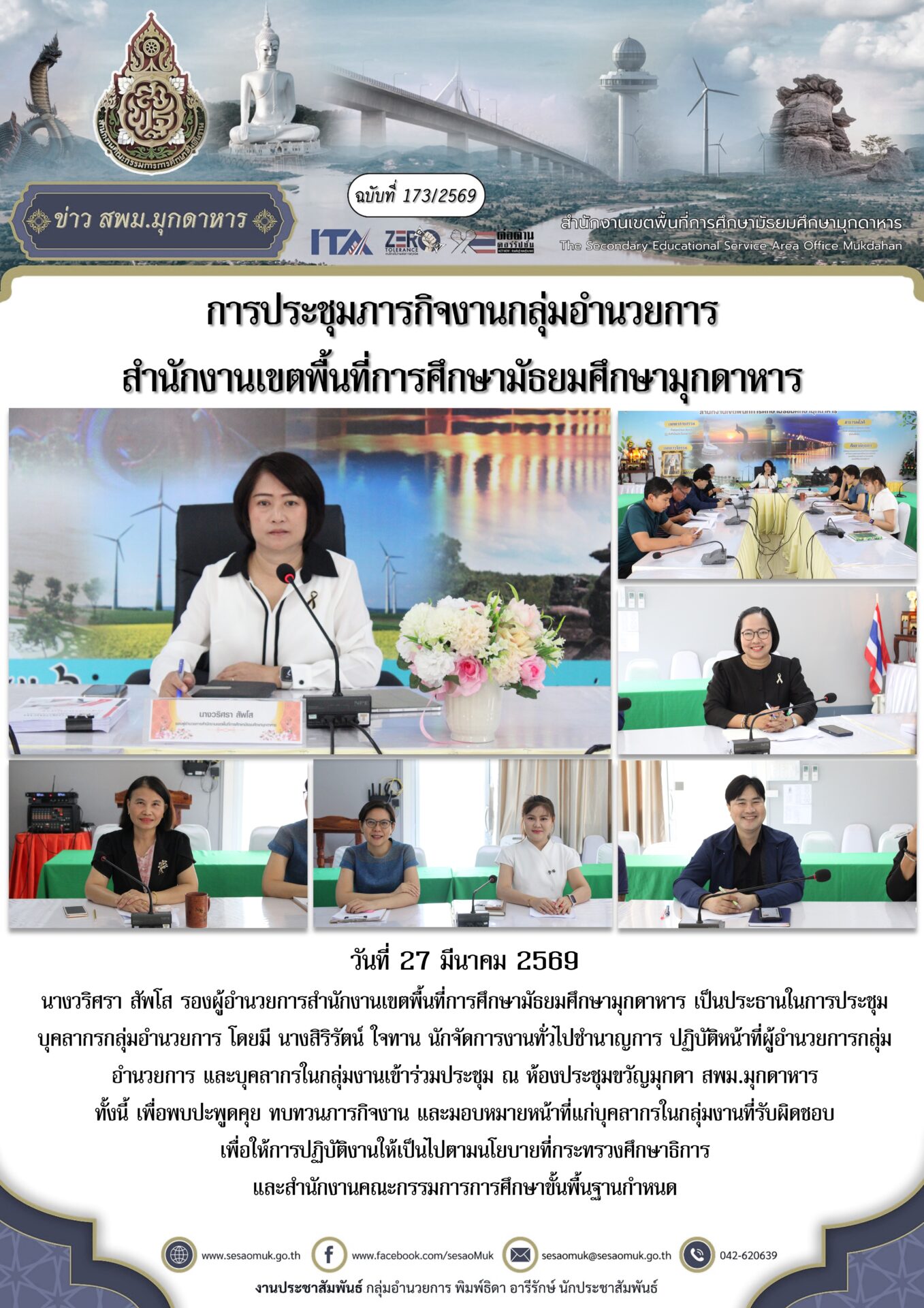 วันที่ 27 มีนาคม 2569 นางวริศรา สัพโส รองผู้อำนวยการสำนักงานเขตพื้นที่การศึกษามัธยมศึกษามุกดาหาร เป็นประธานในการประชุมบุคลากรกลุ่มอำนวยการ โดยมี นางสิริรัตน์ ใจทาน นักจัดการงานทั่วไปชำนาญการ ปฏิบัติหน้าที่ผู้อำนวยการกลุ่มอำนวยการ และบุคลากรในกลุ่มงานเข้าร่วมประชุม ณ ห้องประชุมขวัญมุกดา สพม.มุกดาหาร ทั้งนี้ เพื่อพบปะพูดคุย ทบทวนภารกิจงาน และมอบหมายหน้าที่แก่บุคลากรในกลุ่มงานที่รับผิดชอบ เพื่อให้การปฏิบัติงานให้เป็นไปตามนโยบายที่กระทรวงศึกษาธิการ และสำนักงานคณะกรรมการการศึกษาขั้นพื้นฐานกำหนด