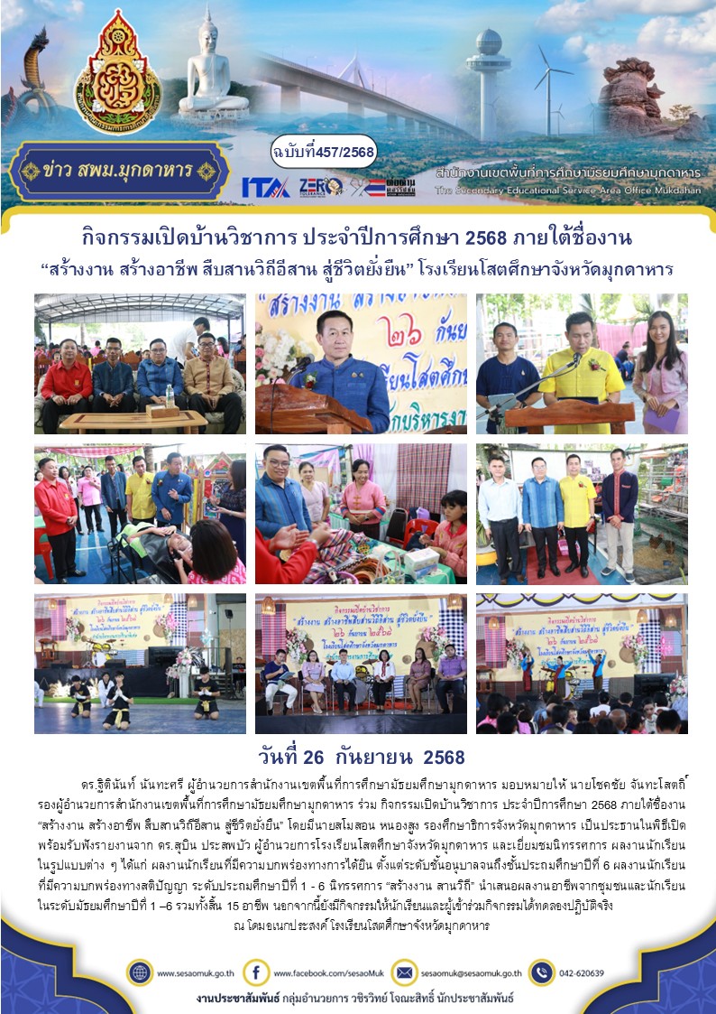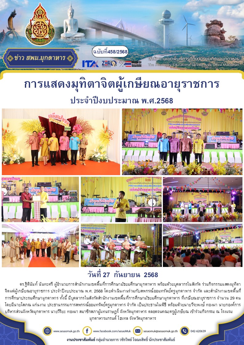 วันที่ 27 กันยายน 2568 ดร.ฐิตินันท์ นันทะศรี ผู้อำนวยการสำนักงานเขตพื้นที่การศึกษามัธยมศึกษามุกดาหาร พร้อมด้วยบุคลากรในสังกัด ร่วมกิจกรรมแสดงมุทิตาจิตแด่ผู้เกษียณอายุราชการ ประจำปีงบประมาณ พ.ศ. 2568 โดยดำเนินงานร่วมกับสหกรณ์ออมทรัพย์ครูมุกดาหาร จำกัด และสำนักงานเขตพื้นที่การศึกษาประถมศึกษามุกดาหาร ทั้งนี้ มีบุคลากรในสังกัดสำนักงานเขตพื้นที่การศึกษามัธยมศึกษามุกดาหาร ที่เกษียณอายุราชการ จำนวน 29 คน โดยมีนายโสภณ แก่นงาม ประธานกรรมการสหกรณ์ออมทรัพย์ครูมุกดาหาร จำกัด เป็นประธานในพิธี พร้อมด้วยนายวีระพงษ์ ทองผา นายกองค์การบริหารส่วนจังหวัดมุกดาหาร นายวิริยะ ทองผา สมาชิกสภาผู้แทนราษฎร์ จังหวัดมุกดาหาร ตลอดจนคณะครูผู้เกษียณ เข้าร่วมกิจกรรม ณ โรงแรมมุกดาหารแกรนด์ โฮเทล จังหวัดมุกดาหาร
